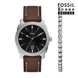 FOSSIL 官方旗艦館 Machine 簡約經典手錶手鏈套組 棕色真皮錶帶 42MM FS6081SET