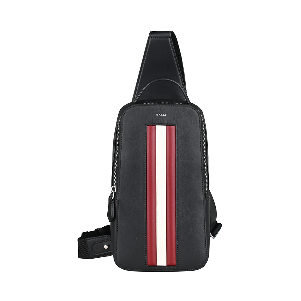 BALLY BALLY Mythos燙印字母LOGO十字紋再生牛皮拉鍊胸掛包(黑x紅白條紋)