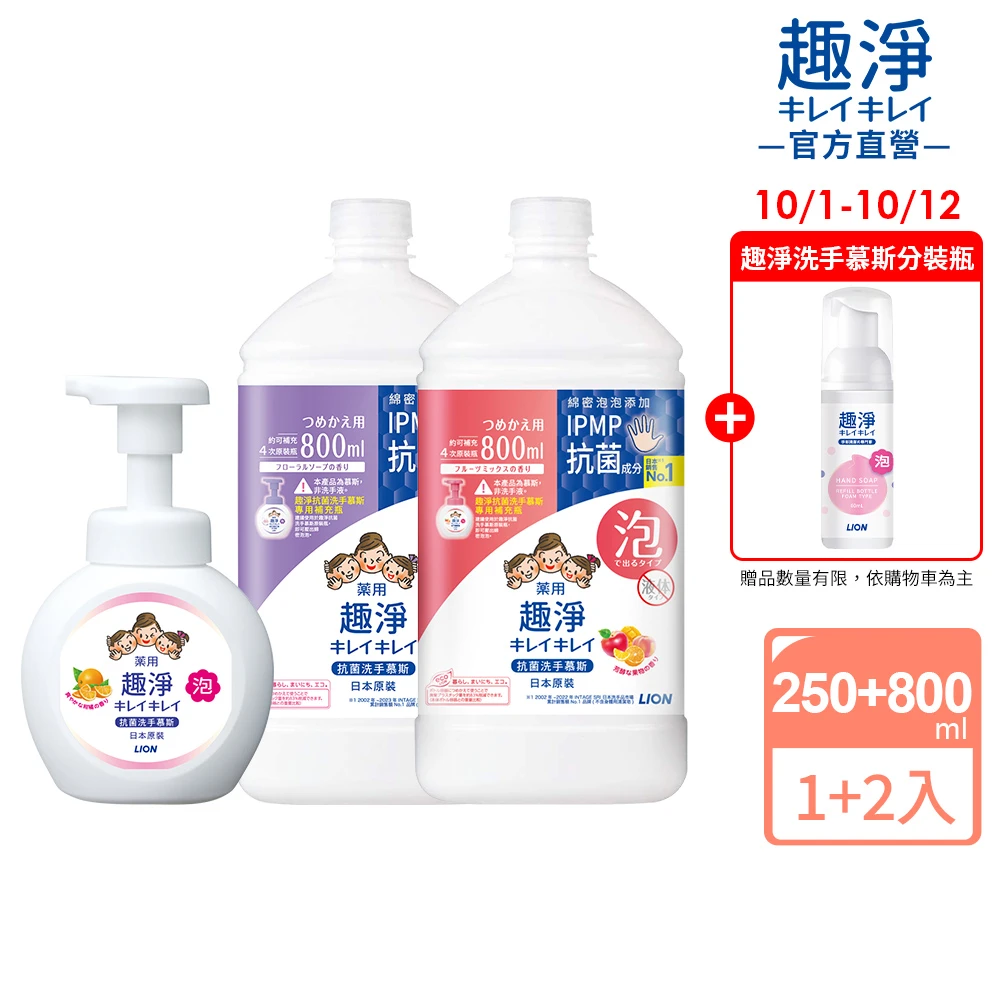 LION 獅王 趣淨抗菌洗手慕斯超值組1+2瓶組-柑橘/果香/花香(250mlx1+800mlx2)