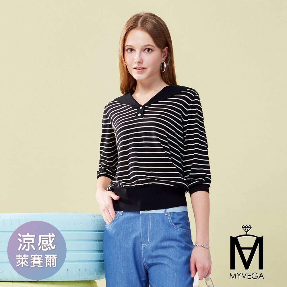 MYVEGA 麥雪爾 MA水手領條紋七分袖針織上衣-黑(通勤風/)