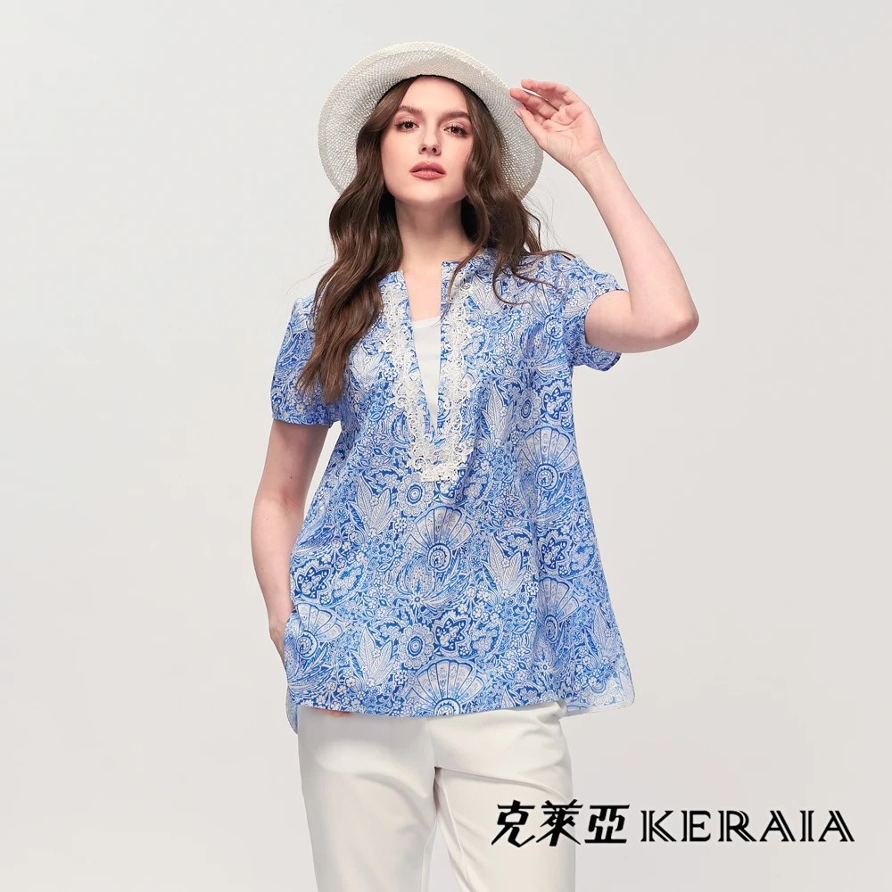 預購 KERAIA 克萊亞 藍瓷流韻假兩件式棉質上衣