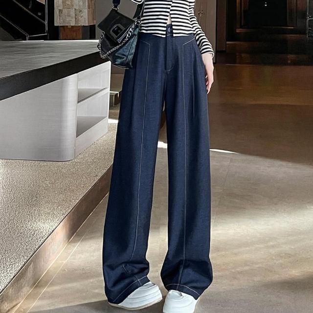 預購 MsMore 激瘦垂感丹寧牛仔西裝闊腿高腰窄版休閒直筒長褲#124496(黑/黑灰/牛仔藍)