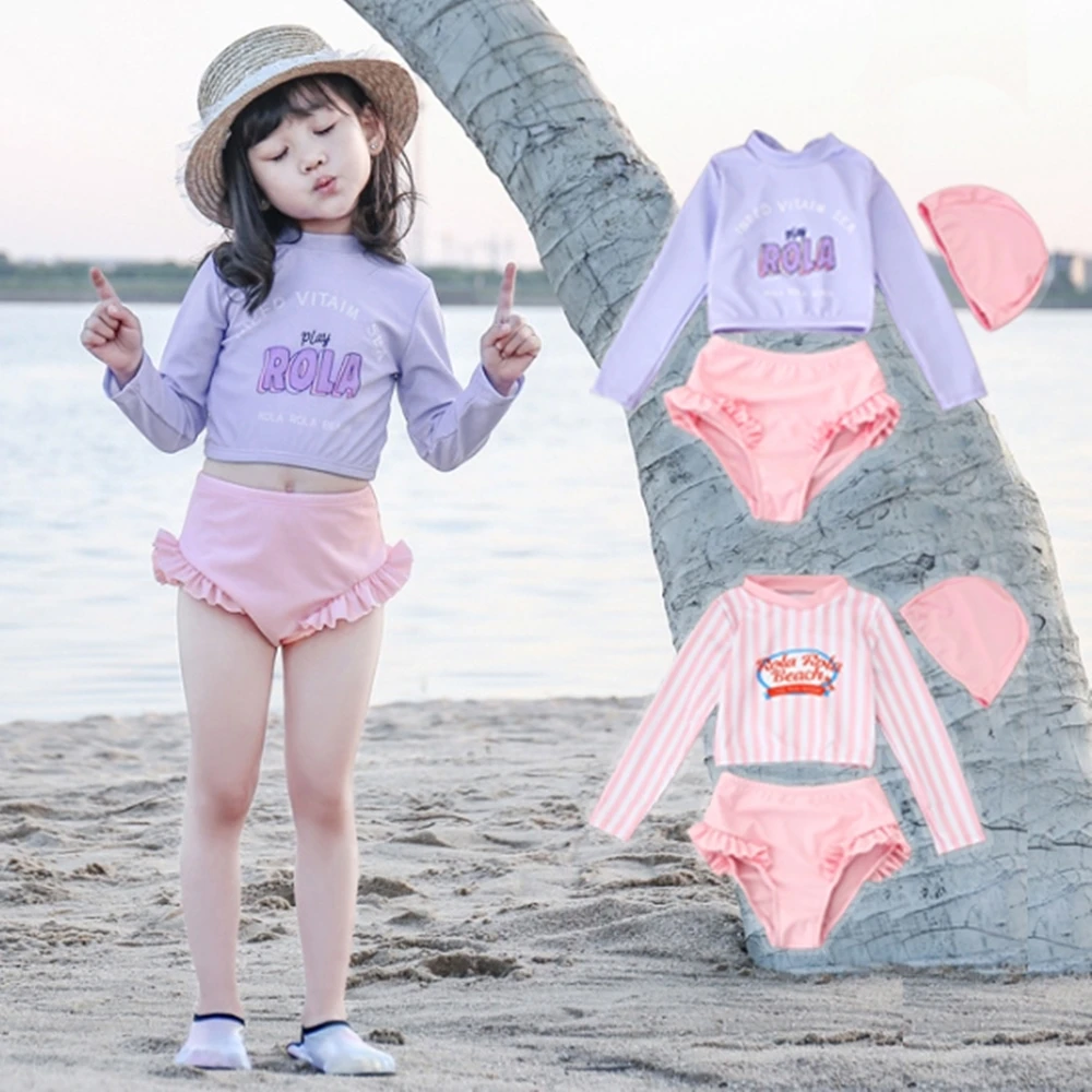 橘魔法 女孩粉嫩插肩長袖短版泳衣+泳褲+泳帽(3件式 泳裝 泳衣 玩水 防曬 兒童 女童 童裝)