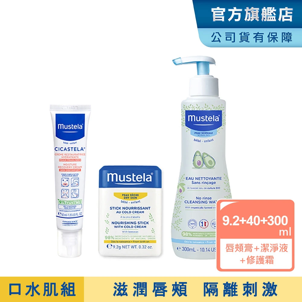 Mustela 慕之恬廊 口水肌養護組(高效唇頰雙護膏9.2g+免用水潔淨液300ml+修護霜40ml)