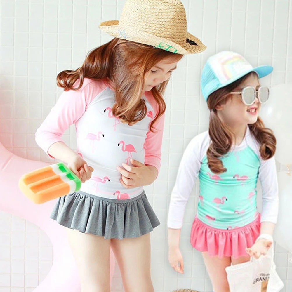橘魔法 夏日紅鶴防曬七分袖泳裝+泳褲褲裙(2件式 火焰鳥 水母衣 泳褲 泳褲裙 泳裝 泳衣 兒童 女童 兒童)