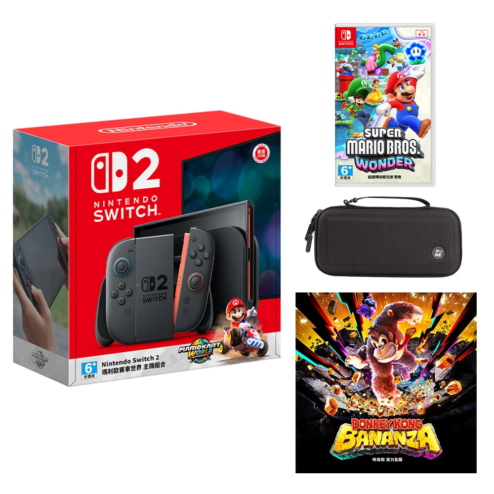 預購 Nintendo 任天堂 Switch 2 瑪利歐賽車世界 主機組+《蕉力全開》+《驚奇》+《良值 NS2收納包 黑》+《9H貼