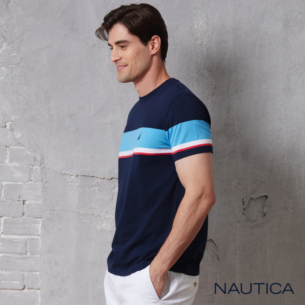 NAUTICA 官方旗艦 男裝 跳色拼接條紋短袖T恤(藍色)