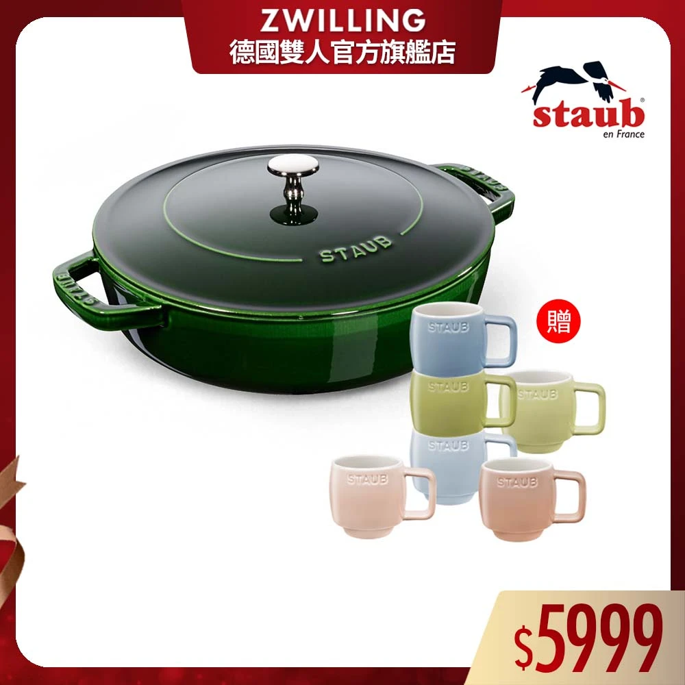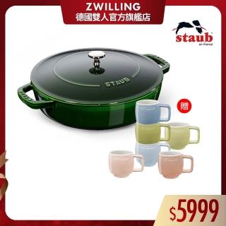 法國Staub 羅勒綠迴力釘點蓋圓型鑄鐵鍋淺燉鍋24cm贈馬卡龍濃縮杯6入組(德國雙人牌集團官方直營)