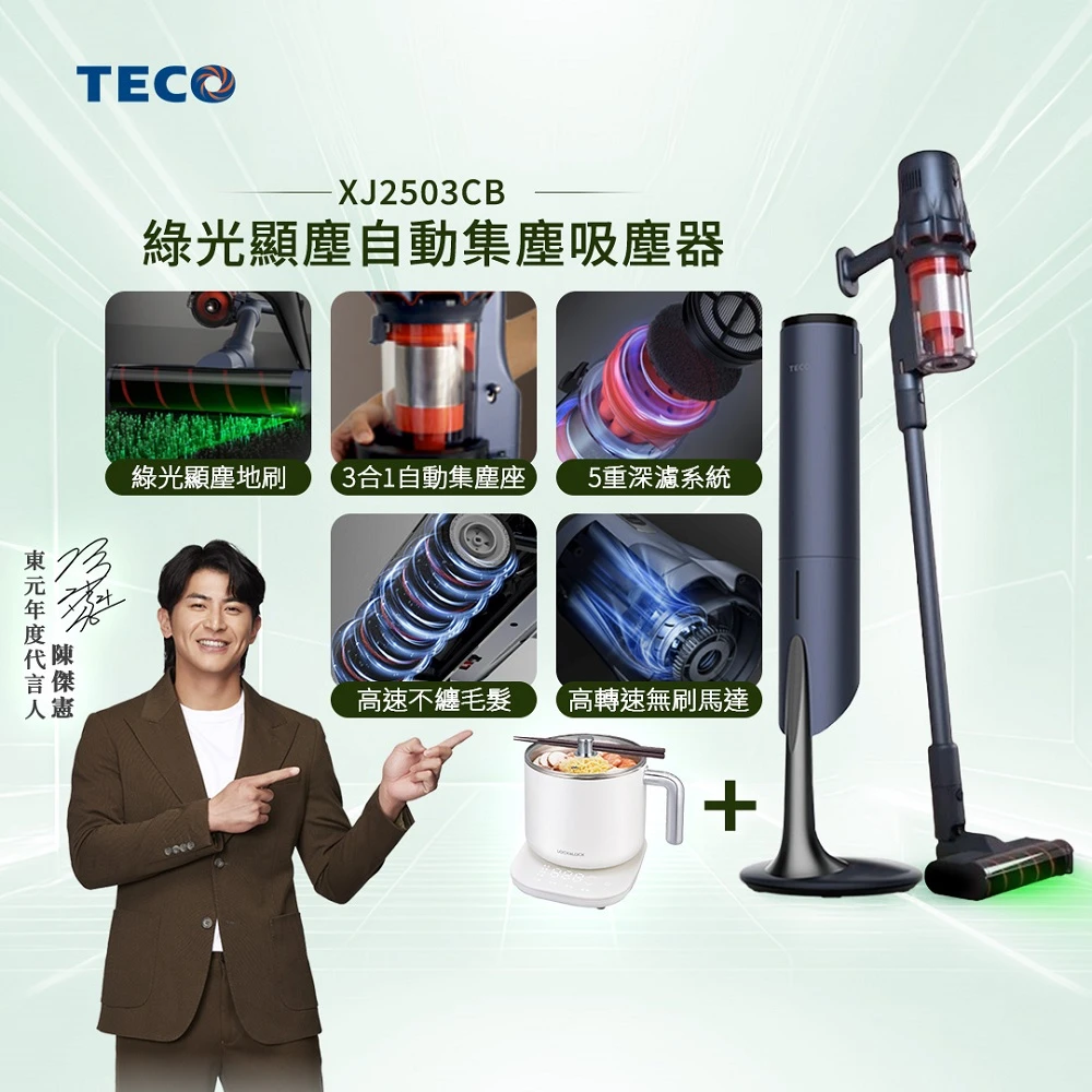陳傑憲代言TECO 東元 綠光顯塵自動集塵吸塵器+樂扣樂扣多功能電煮鍋1.5公升(XJ2503CB)