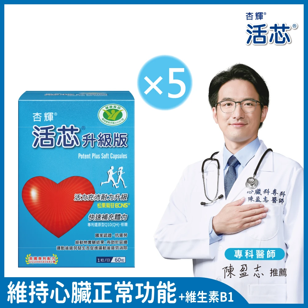 杏輝醫藥 活芯升級版軟膠囊 國家健康食品 5入(共300粒-Q10 專利成分ECNS 提升2倍耐力降低6成5疲累感)