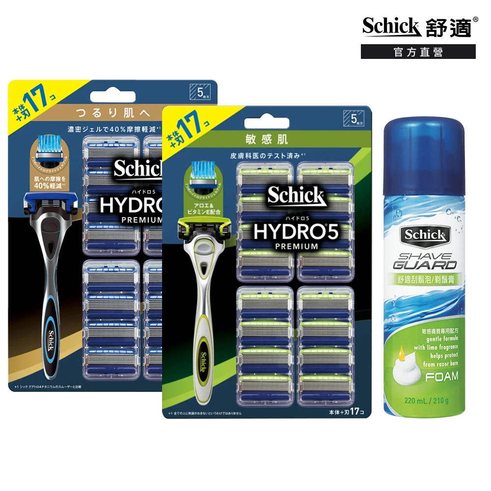 Schick 舒適牌 水次元5 Premium 痘痘敏感肌/保濕款刮鬍組(1刀把17刀片+刮鬍泡210g)