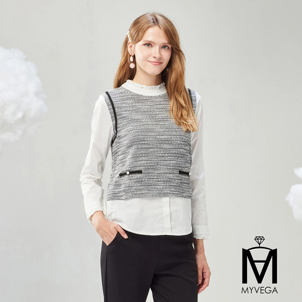 MYVEGA 麥雪爾 MA小香風粗花呢假兩件上衣-灰(通勤風/)