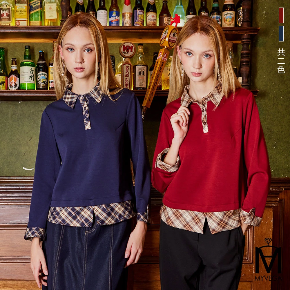預購 MYVEGA 麥雪爾 MA假兩件式素色拼接格紋長袖上衣-共二色(日系/女上衣/純棉/女長袖上衣)