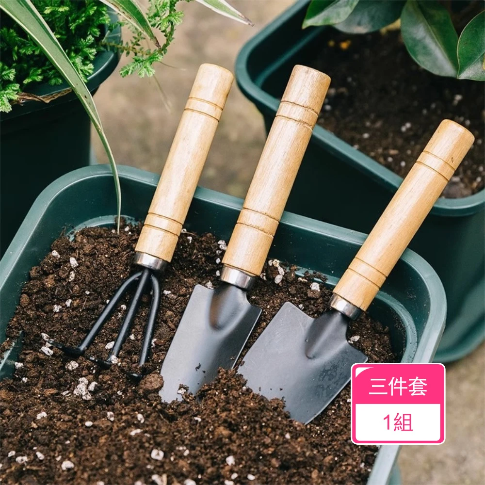 Dagebeno荷生活 加粗木紋手柄園藝工具三件套 小巧便攜防污鍍漆一體式園藝工具(1組)
