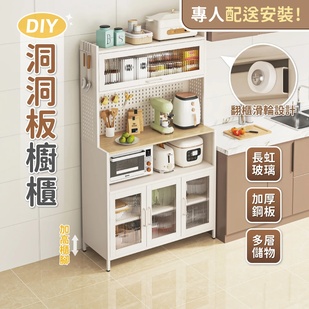 慢慢家居 專人組裝-升級長虹玻璃-廚房大容量帶插座洞洞板櫥櫃電器櫃-100cm(餐廚櫃 置物櫃 餐邊櫃)