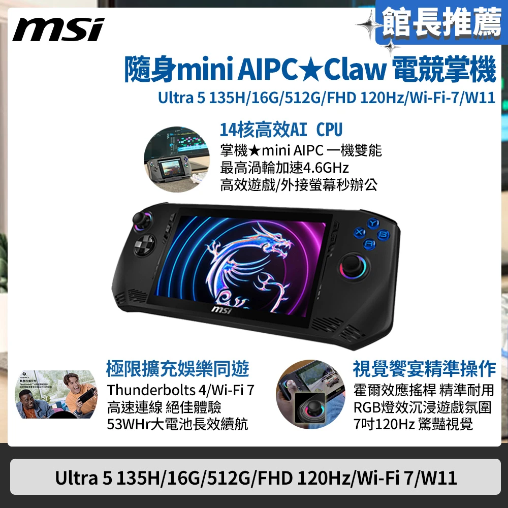 MSI 微星 Claw 電競掌機(Intel Core Ultra 5 135H/16G/512G SSD/W11/A1M-027TW)