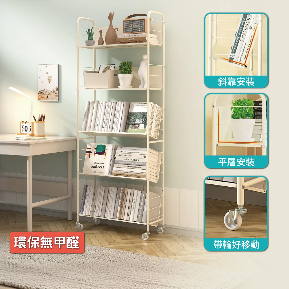 慢慢家居 升級層板-奶油風超穩固可移動鐵藝五層書架(文件推車 兒童書架 移動書櫃 置物架)
