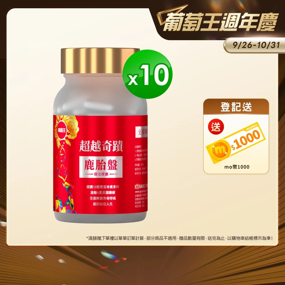葡萄王 超越奇蹟鹿胎盤馥活膠囊30粒x10盒(維他命C 穀胱甘肽GSH 膠原蛋白 益生菌 賽洛美 葡萄王官方)