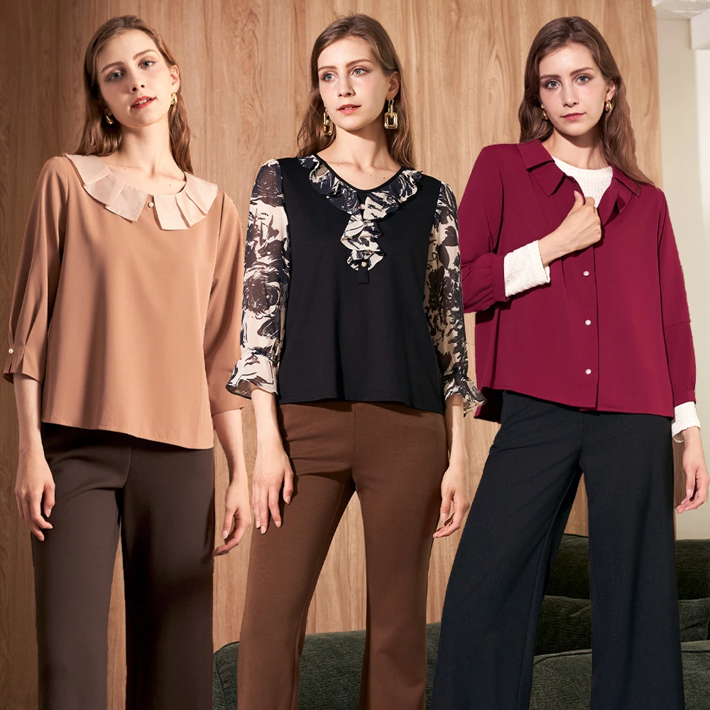 TOWN’WEAR 棠葳 精選翻領雪紡上衣(三款任選/中大尺碼/多色/素色/圓領/大學T/上衣/印花)