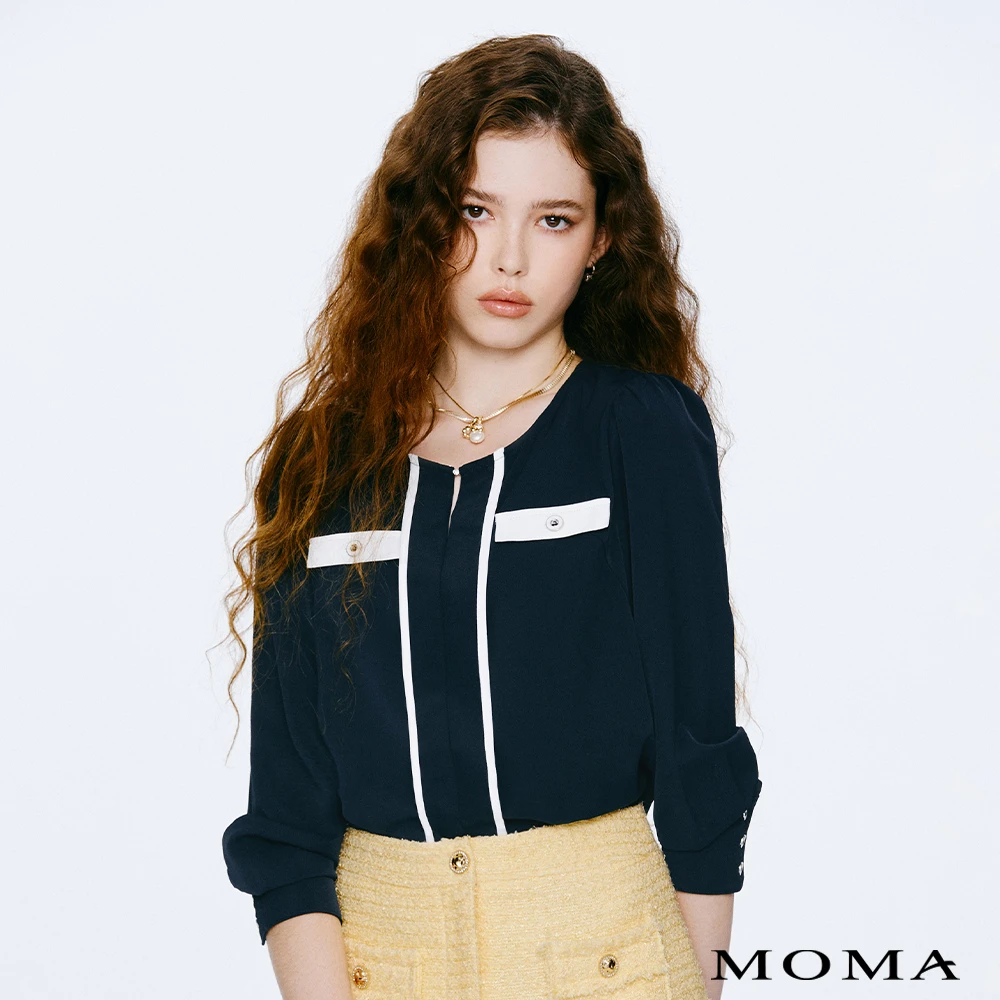 MOMA 輕質感小香水鑽泡泡袖上衣(深藍色)