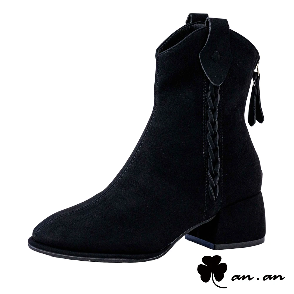 預購 nono house an.an 知性編織V口粗跟短靴(黑)