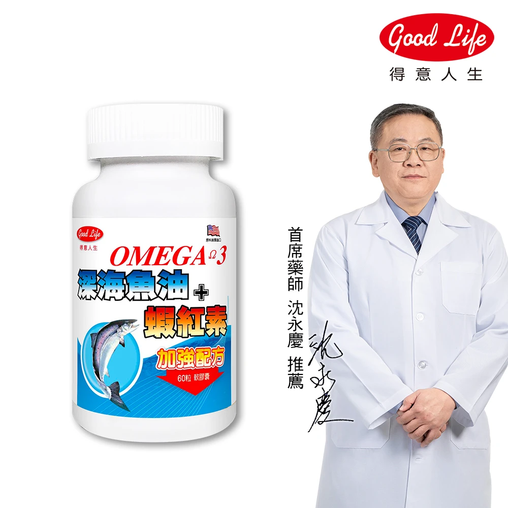 得意人生 深海魚油+蝦紅素_富含DHA EPA 1入組(共60粒 沈永慶藥師推薦 高單位Omega-3魚油 蝦紅素)