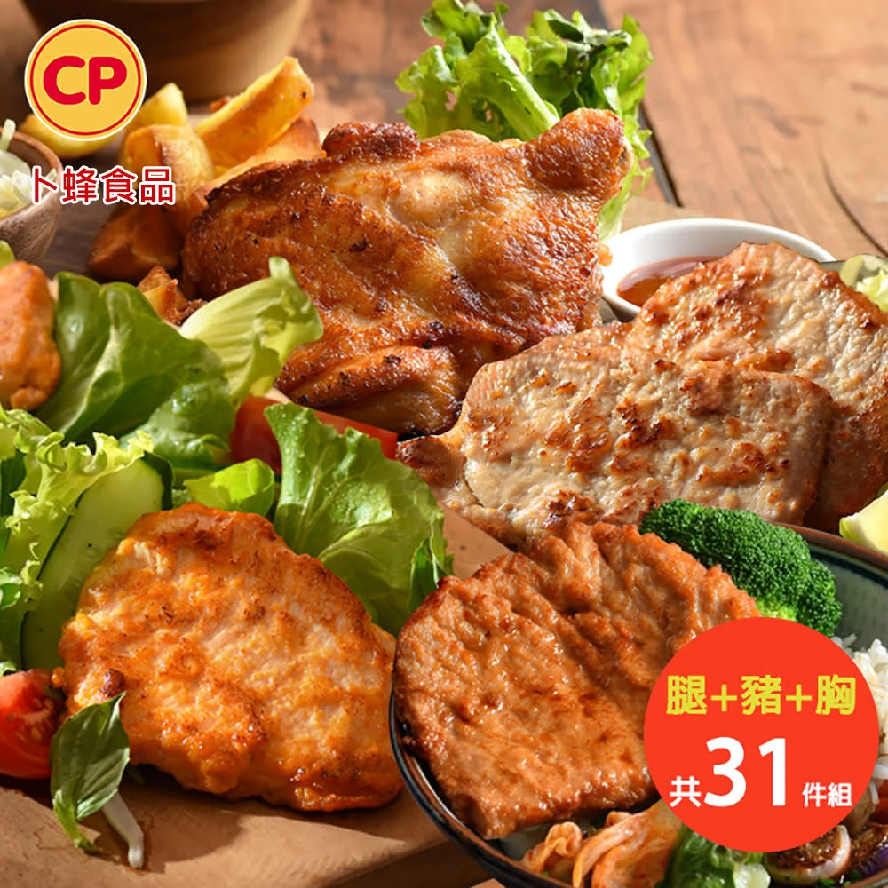 卜蜂 雞腿排豬排雞胸量販組-共31件(去骨雞腿排-蒜味x8+香檸雞胸肉X7+古早味豬排x8+湖鹽豬排x8_團購美食)