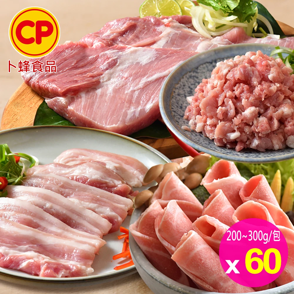 卜蜂 饕級鮮嫩雪花里肌.梅花火鍋片.五花燒烤片.黃金比例豬絞肉 超值60包組(200-300g/包)