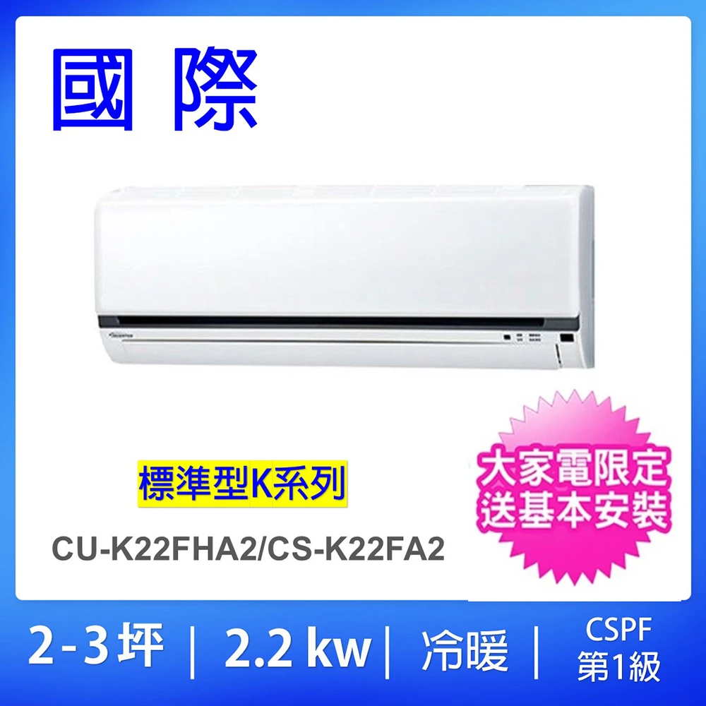 Panasonic 國際牌 2-3坪標準型2.2KW變頻冷暖分離式冷氣(CU-K22FHA2/CS-K22FA2)