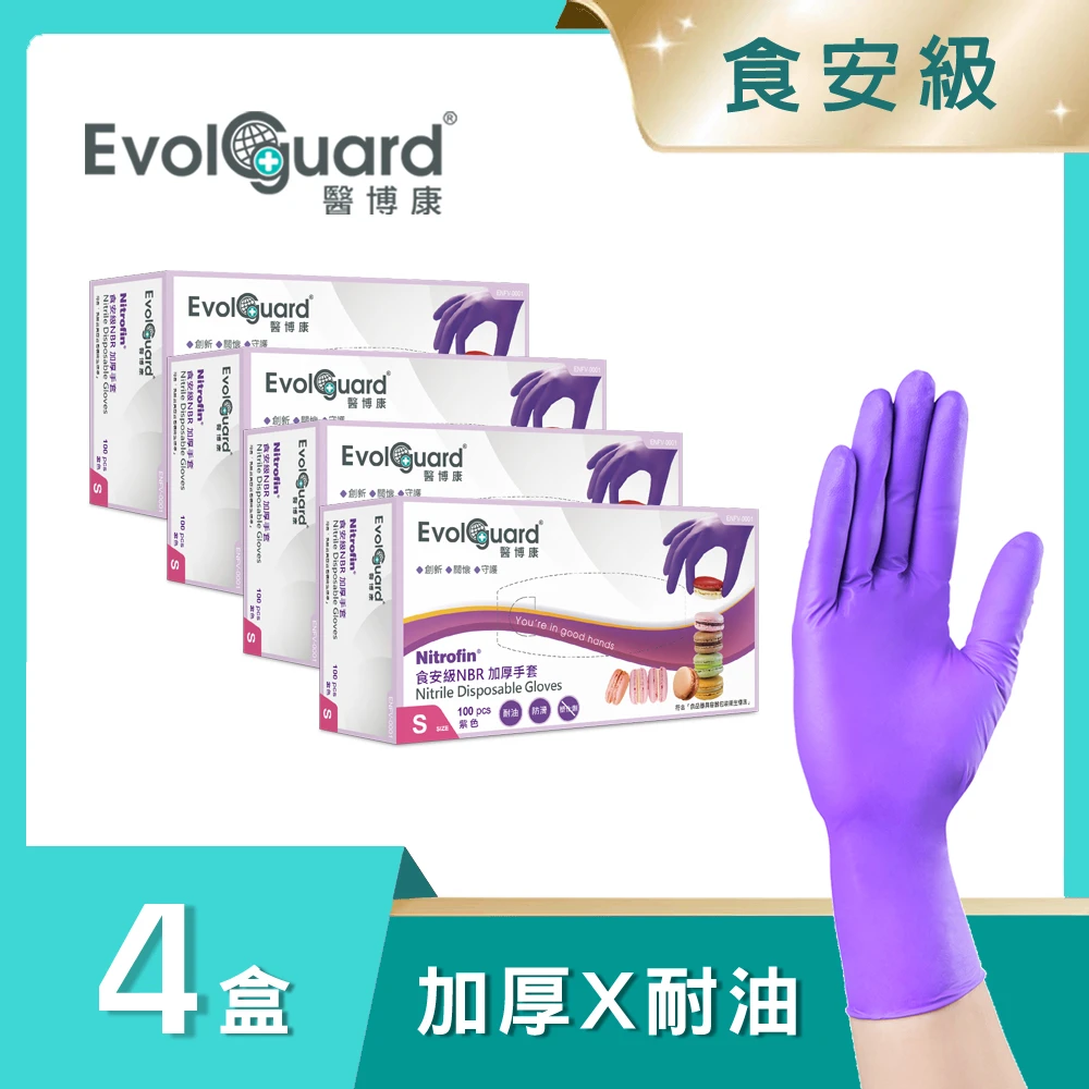 Evolguard 醫博康 Nitrofin食安級馬卡龍丁腈NBR手套 四盒 共400入(加厚/紫色/食品級/廚房手套)