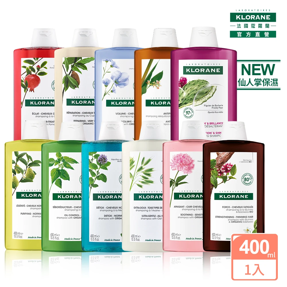 KLORANE 蔻蘿蘭官方直營 植萃洗髮精400ml(養髮/控油/護色/修護/蓬鬆/涼感/全效/舒敏/抗屑/淨透/保濕)